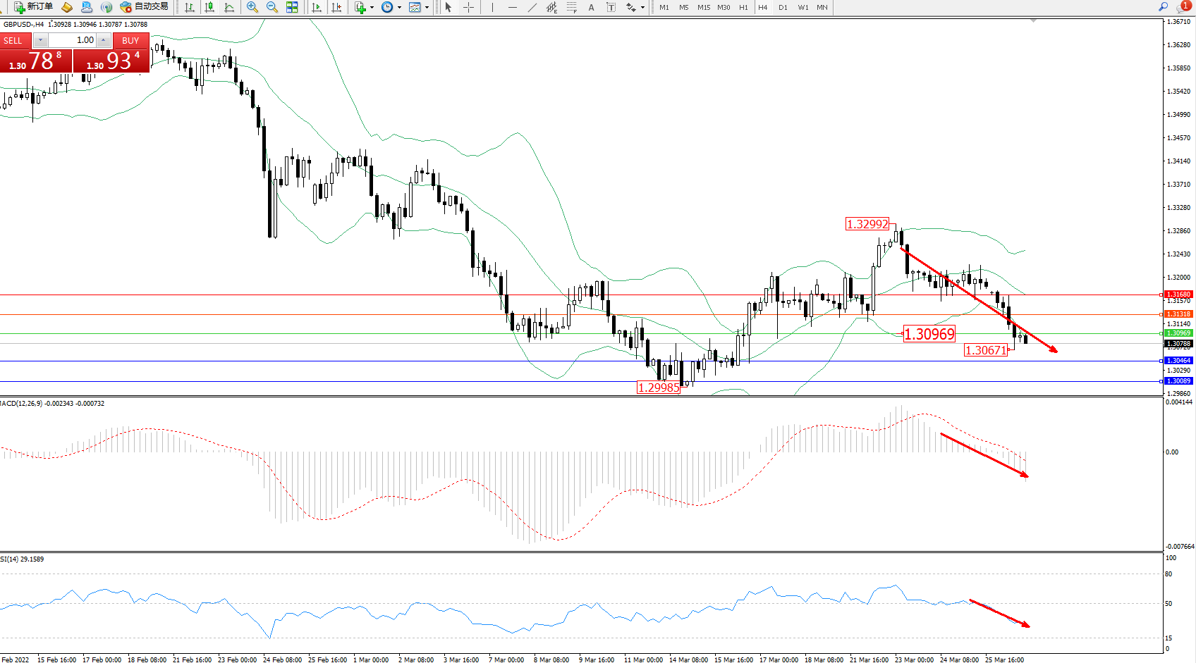 技术点评:空头动力延续布林带指标下轨附近持续震荡下挫,低位抵达1.30671位置节点后开始整理,短期跌势或将延续,前期低位1.29985位置近在咫尺陪我在即,布林带指标呈向下移动趋势走势良好,且有逐渐张口迹象,MACD指标处于0轴线下方空头区域维持震荡下行中,RSI指标处于50均衡线下方维持整理不断下移中;