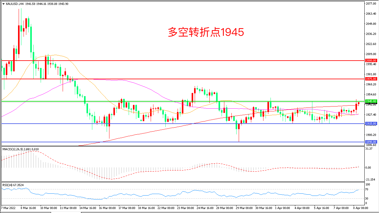 4小时图看,金价以1915一线为依托震荡上行,短期行情有所回暖,均线系统走平, MACD红柱增加,RSI指标走高,日内震荡上行概率较大。