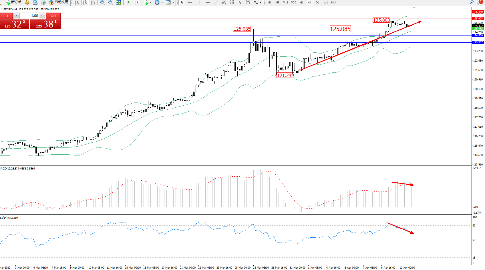 技术点评:多头动力延续布林带指标通道中上轨区间持续震荡上扬,高位抵达125.800附近节点后开始整理平移,短期多头拉升上扬走势或将持续,布林带指标呈上行趋势走势后开始高位缓慢收口走势中,MACD指标处于多头区域维持整理平移中,RSI指标处于多头区域高位缓慢开始回撤下行;