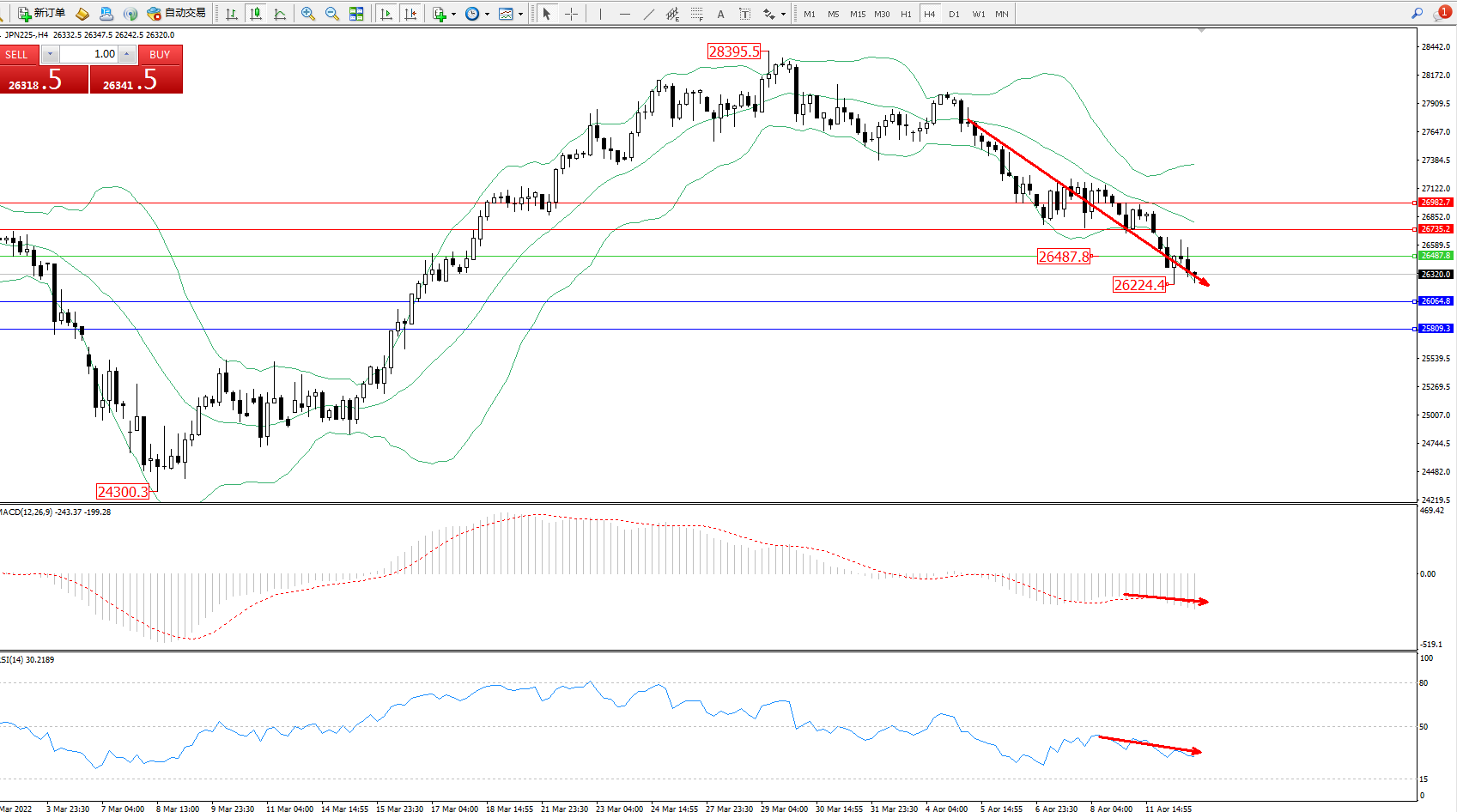 技术点评:空头动力延续布林带指标通道中下轨区间持续震荡下行,低位抵达26224位置节点后开始整理,短期空头动力有进一步向下移动态势,布林带指标呈收口走势不断向下移动中,MACD指标处于空头区域维持整理平移,RSI指标处于空头区域维持弱势整理向下移动中;