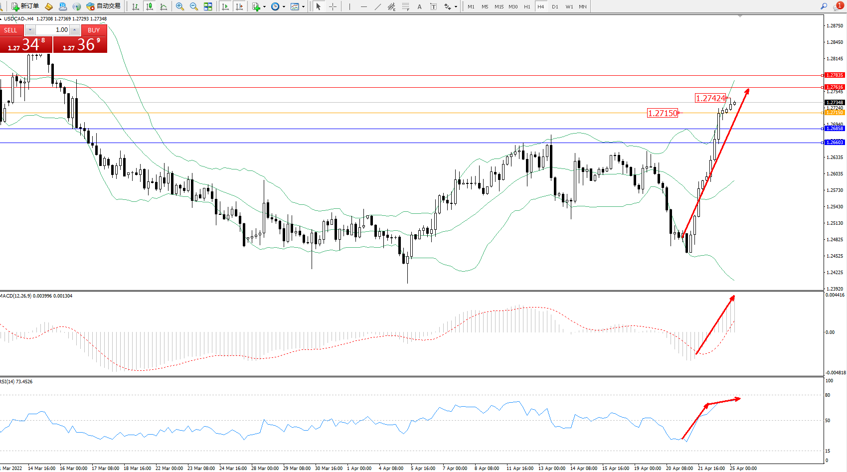 美元加元USDCAD——4小时K线图显示: