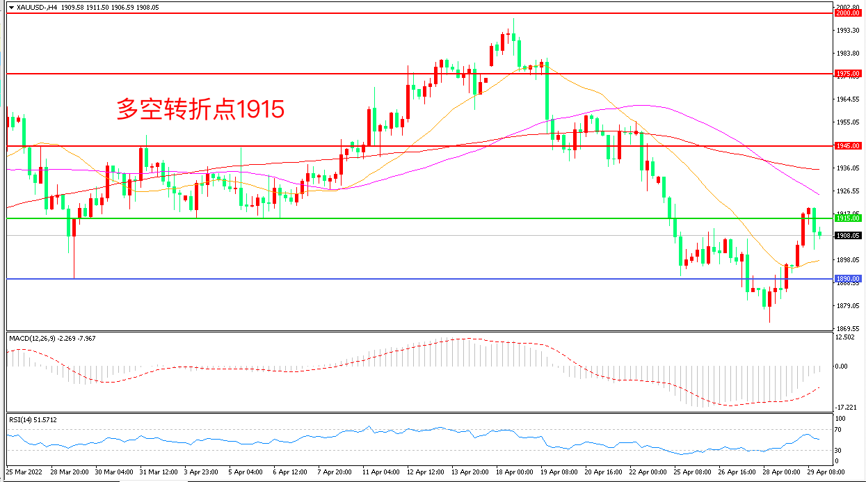 上周,美国第一季度实际GDP 2020年第二季度以来首次录得负值,PCE数据意外不及预期,现货黄金受到提振,冲高回落后收报1908.15美元/盎司。目前美联储正面临着两难境地,既要让经济放缓到足以控制通胀的程度,但放缓程度又不至于导致经济衰退,本周美联储将迎来利率决议,非农数据和利率决议掀起的风暴将为金市带来巨大波动。