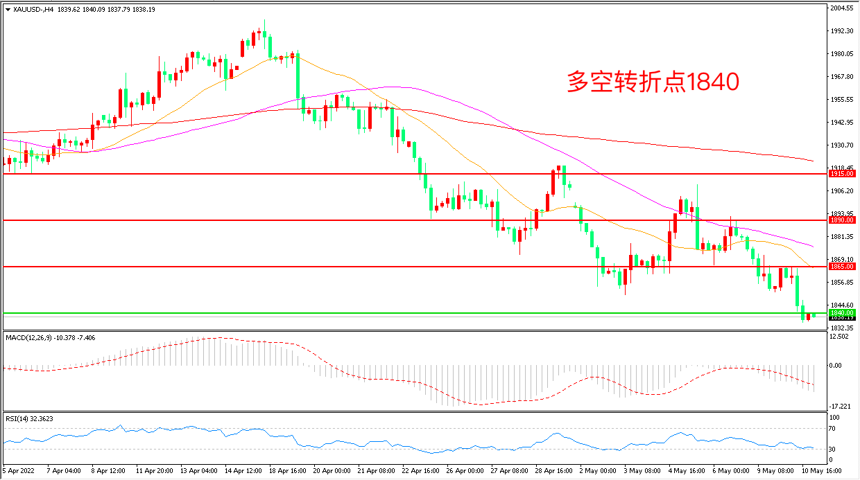 周二(5月10日),多位联储高层支持在接下来2次会议加息50个基点,但这些表态并未给加息预期降温,现货黄金破位下行,收报1839.52美元/盎司。目前咄咄逼人的美元对金价构成巨大压力,这一趋势暂时不会得到扭转,日内若通胀数据若走高会加强美联储激进“收水”的理由,黄金可能面临进一步的下行风险。
