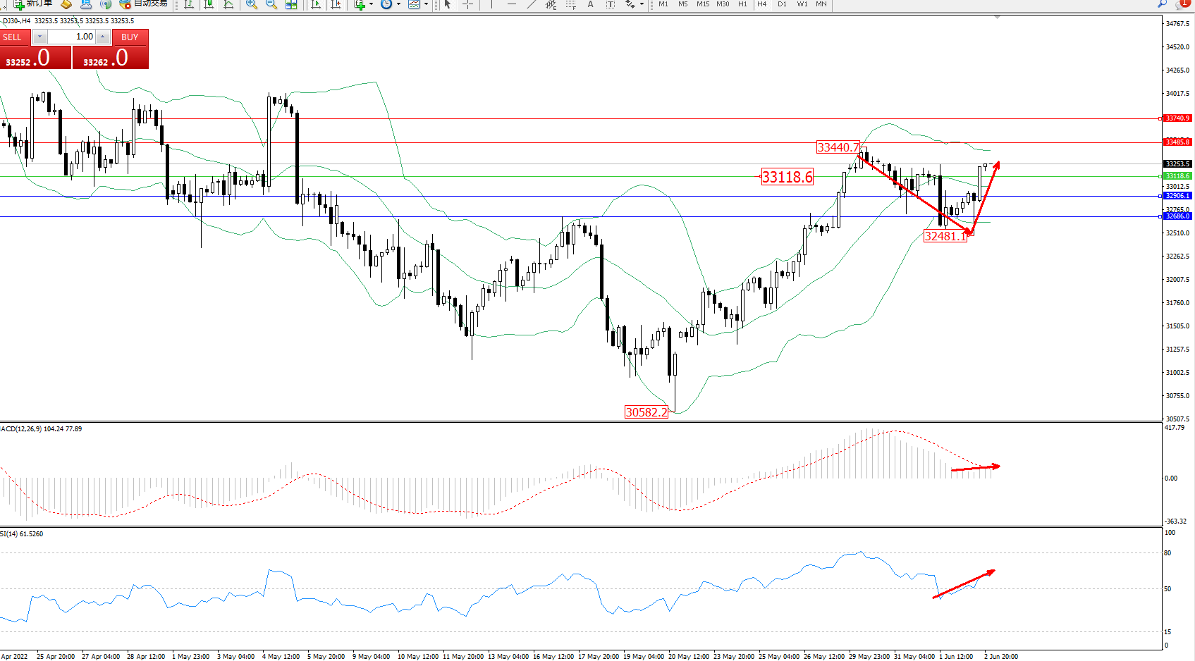 技术点评:高位空头动力维持震荡下行,低位抵达32481附近节点后强势拉升,处于布林带指标中上轨区间整理,布林带指标呈收口走势持续中,MACD指标处于0轴线上方多头区域维持整理,RSI指标处于50均衡线上側维持窄幅震荡上扬;