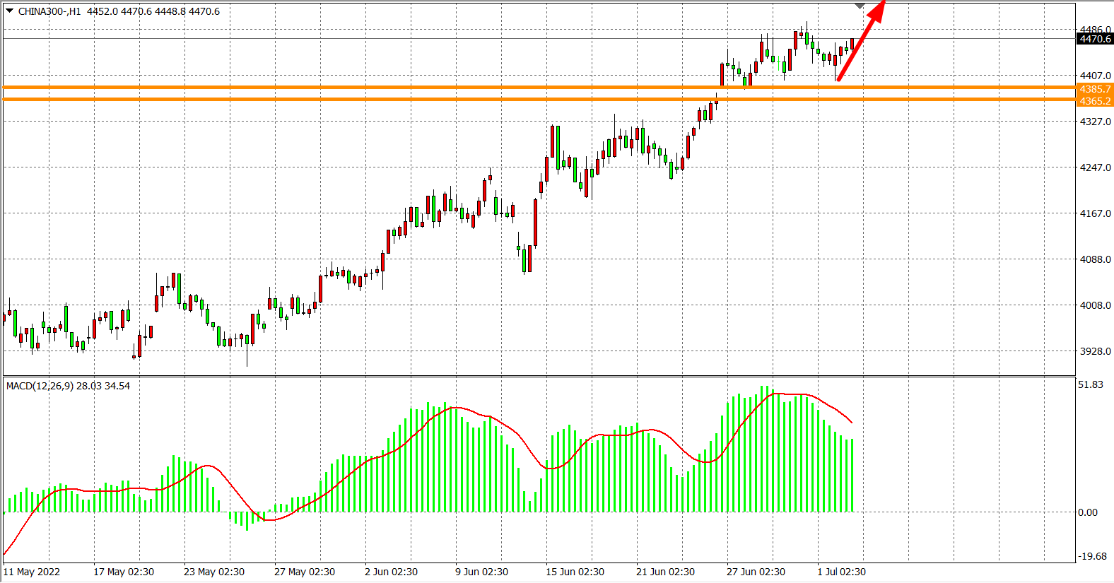 1小时图看,沪深300低开回探4400附近,但仍处于支撑4385之上,同时MADC量能开始于零轴之上走平,预示短期调整有望结束,趋势仍处于多头格局,后市维持在4385之上继续以看涨为主,目标4500-4600