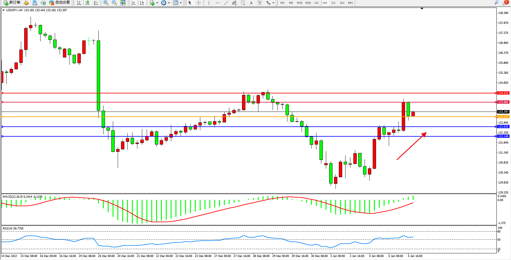 交易策略:133.137上方看涨,目标133.866、134.322