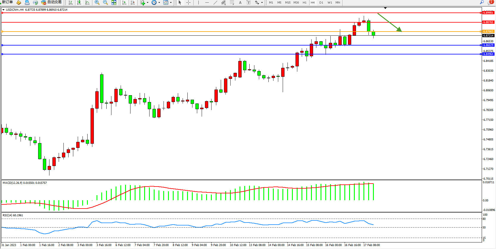 交易策略:6.87663下方看跌,目标6.86029、6.84946