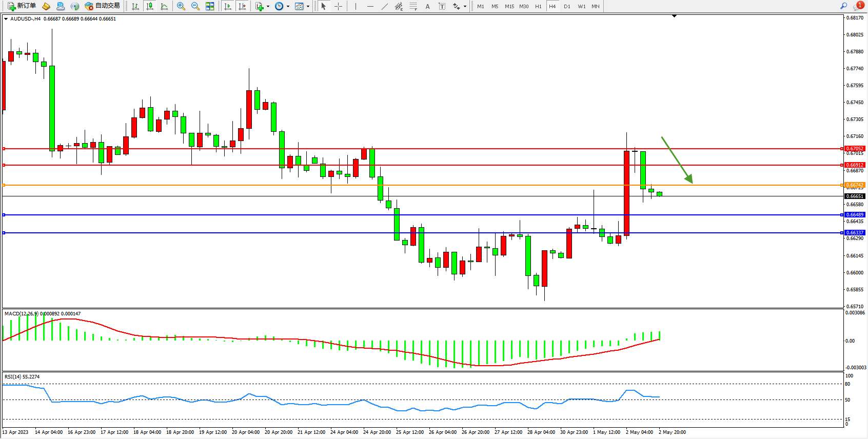 交易策略:0.66742下方看跌,目标0.66489  0.66337