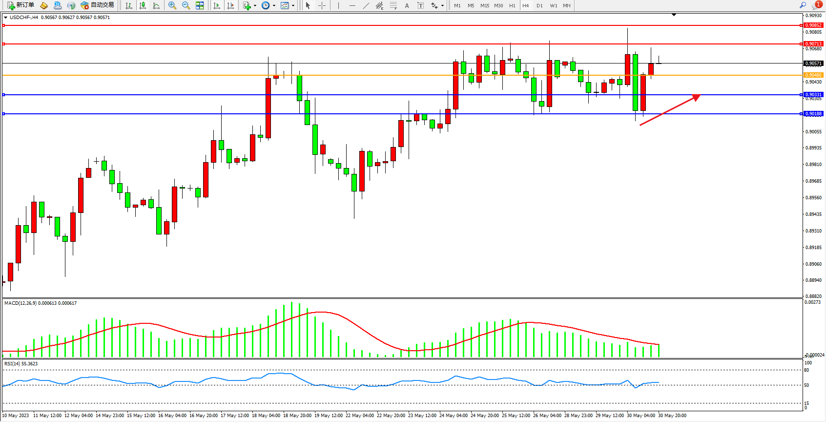 美元瑞郎USDCHF——4小时K线图显示: