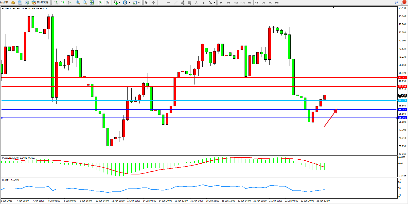 原油维持69.433附近震荡,原油和成品油市场就是被更高的利率拖累,且需求不会像希望的那样快速显现。