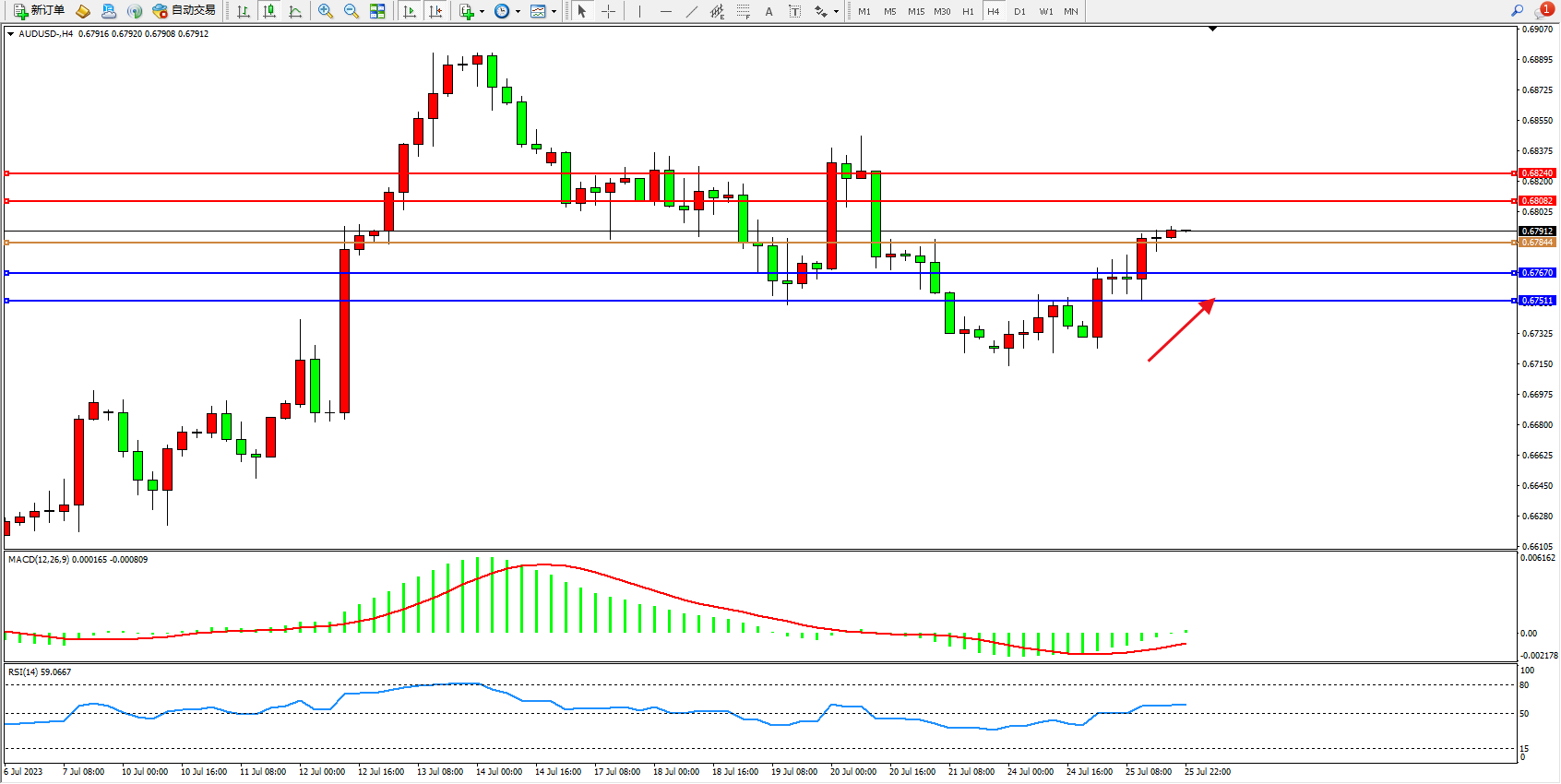 交易策略:0.67844上方看涨,目标0.68082 0.68240