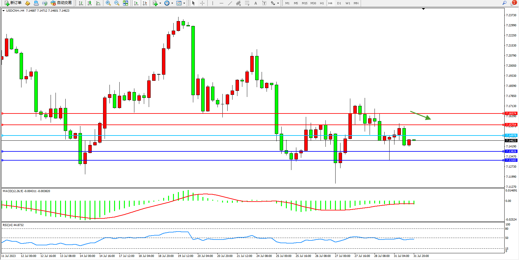 交易策略:7.14978下方看跌,目标1.13826 7.13183