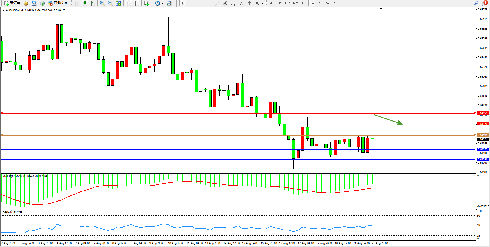 交易策略:0.64191下方看跌,目标0.63957  0.63790