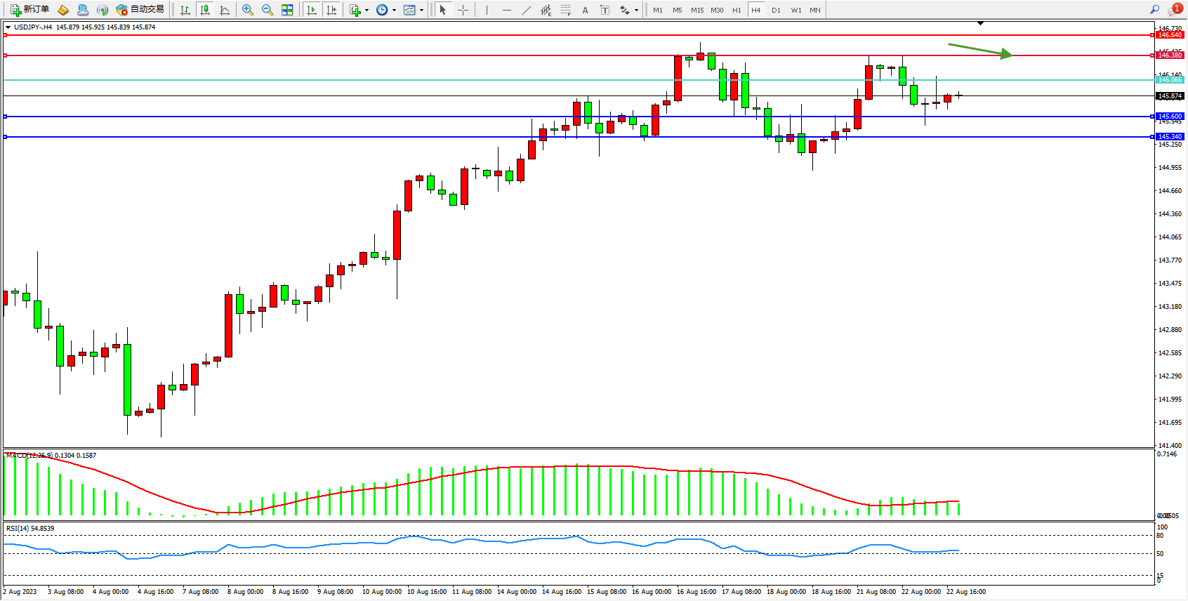 备选策略:146.066上方看涨,目标146.380 146.640