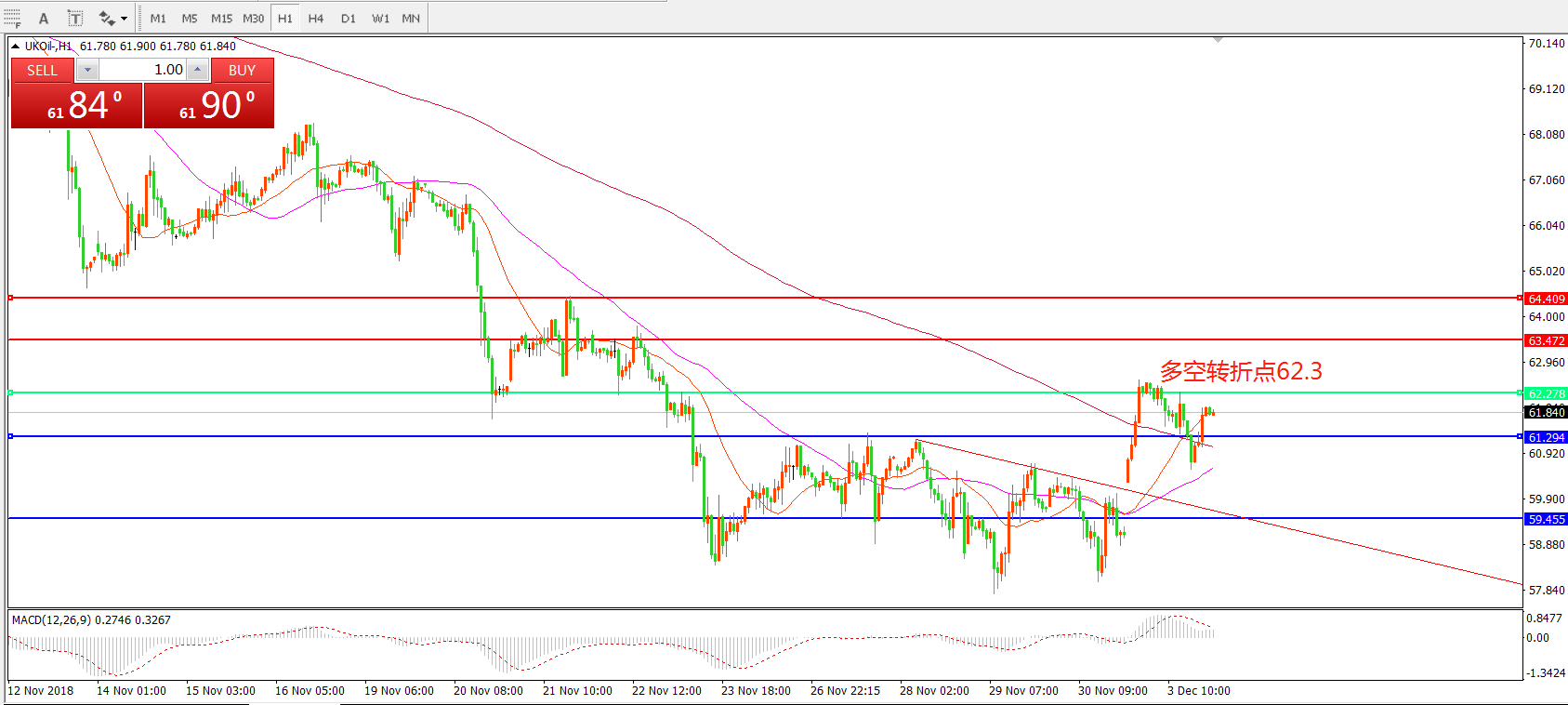 小时图看,油价受G20利好消息影响,跳空高开并站稳前期阻力61.3后陷入震荡,短期均线拐头向上,MACD绿柱缩短,红柱增加,短期仍以反弹做多思路对待。