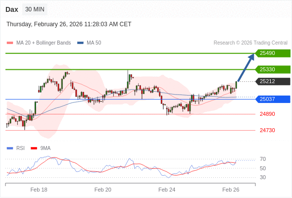在 25037 之上,看涨,目标价位为 25330 ,然后为 25490 。