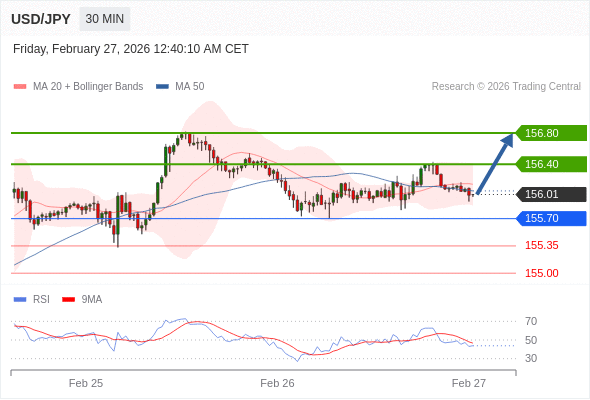 在 155.70 之上,看涨,目标价位为 156.40 ,然后为 156.80 。