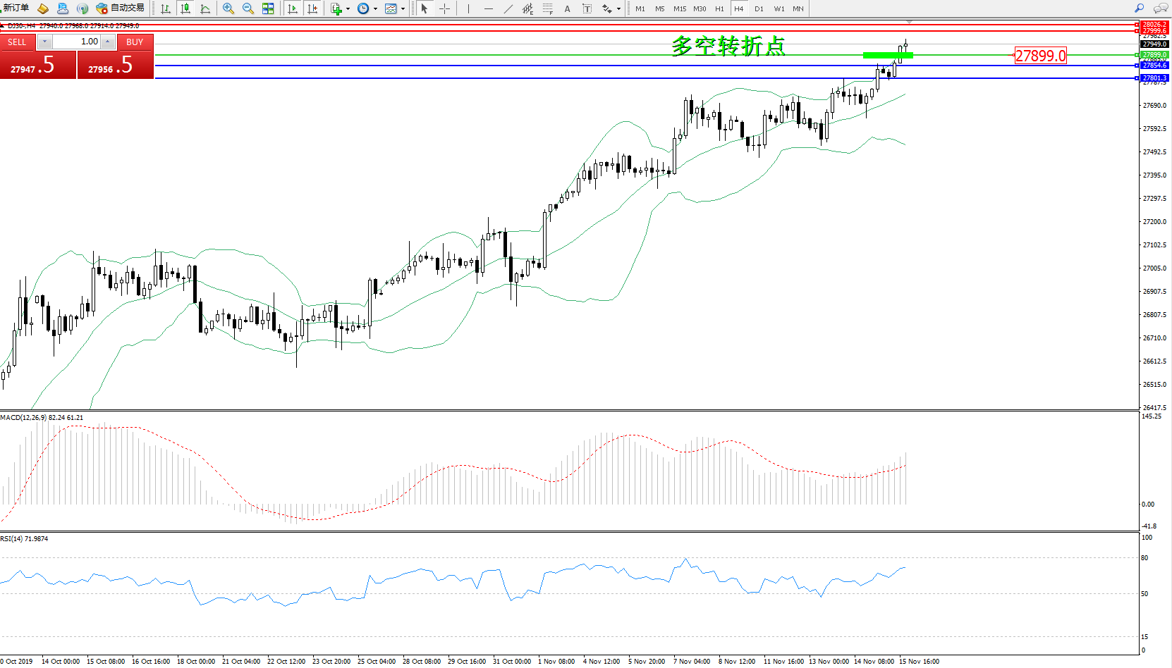 道琼斯指数DJ30—— 4小时K线图显示: