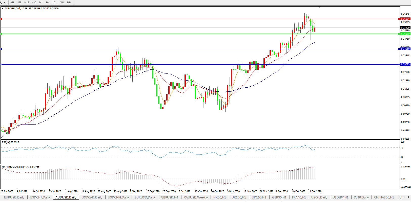 交易策略:0.7500上方看涨,目标0.7600、0.7700