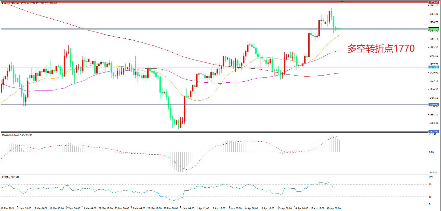 周一(4月19日),在4月28日政策决定公布前,美联储进入缄默期,美元走软和美债收益率回落提振了黄金需求,现货黄金一度大幅拉升逾20美金,但面对1800整数关口,部分多头选择平仓结利,现货黄金震荡回落,收报1770.99美元/盎司。