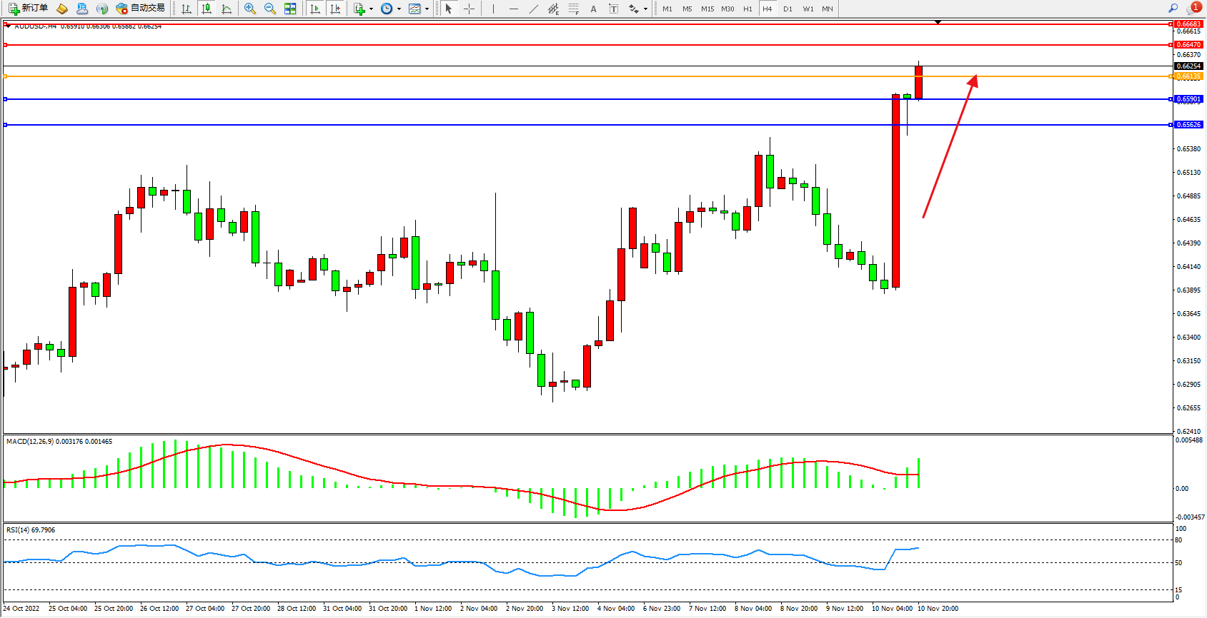 交易策略:0.66135上方看涨,目标0.66470、0.66683