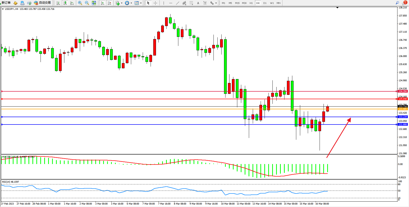 备选策略:133.585下方看跌,目标133.234  132.888