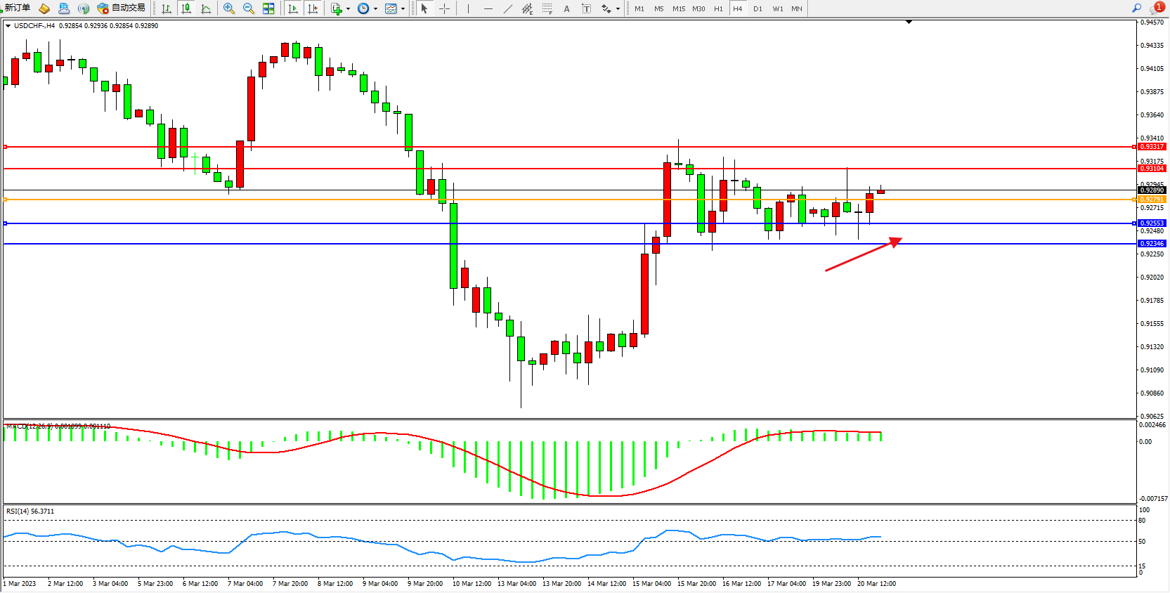 美元瑞郎USDCHF——4小时K线图显示: